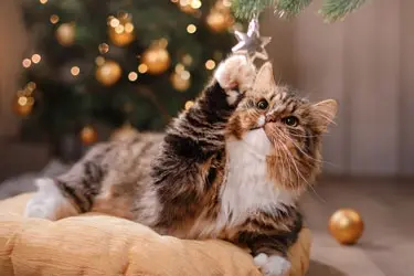 Utiliza decoración segura, preferiblemente irrompible y sin cintas ni espumillón. Las decoraciones brillantes a menudo llaman la atención. Si quieres poner objetos brillantes, cuélgalos lo más alto posible. Esto también es aplicable a las decoraciones frágiles. Las agujas de pino, el agua en la parte inferior del árbol y las decoraciones de chocolate también son venenosas para los gatos. Así que evita que puedan ingerirlas.