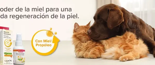 La pomada para heridas y el spray para heridas de Beaphar ayudan a reparar las pequeñas heridas o la piel dañada de las mascotas. La pomada contiene miel natural y el spray contiene propóleo de abeja y se utiliza para el tratamiento de heridas superficiales de la piel, rasguños, piel seca o agrietada y después de las picaduras de garrapatas o insectos.